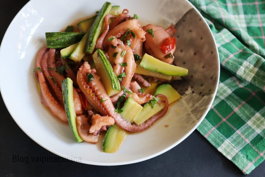 Petits poulpes et courgettes en soupe, prépare ce plat principal fantastique de poisson en une demi-heure. Les petits poulpes sont les cousins des poulpes, ils sont beaucoup plus petits et leurs huit tentacules n’ont qu’une seule rangée de ventouses contrairement aux poulpes qui en ont deux, ils ont une saveur délicate et vivent sur les fonds marins boueux. Avec l’arrivée de l’été, on a sûrement plus envie de mer, de vacances et de délicieux plats de poisson, si en plus ils se préparent en moins de trente minutes, c’est encore mieux, bien sûr avec le poisson déjà nettoyé, disons-le, c’est le vrai tracas et le seul inconvénient qui pourrait nous en faire aimer moins. Mais pas de souci car aujourd’hui, n’importe quel revendeur commercial ou petit magasin de vente de poisson le nettoie et parfois le cuisine aussi. Les petits poulpes se prêtent à tous types de cuisson, même s’ils aiment principalement le gril, bien que ce ne soit pas aujourd’hui ma méthode de cuisson, mais tout aussi simple et rapide que le salmoriglio.