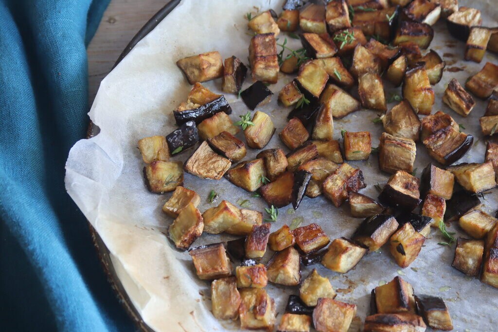 Entre-temps, coupez une aubergine en dés et avec du thym, du sel et de l’huile d’olive, cuisez-la au four pendant 20 minutes à 190°