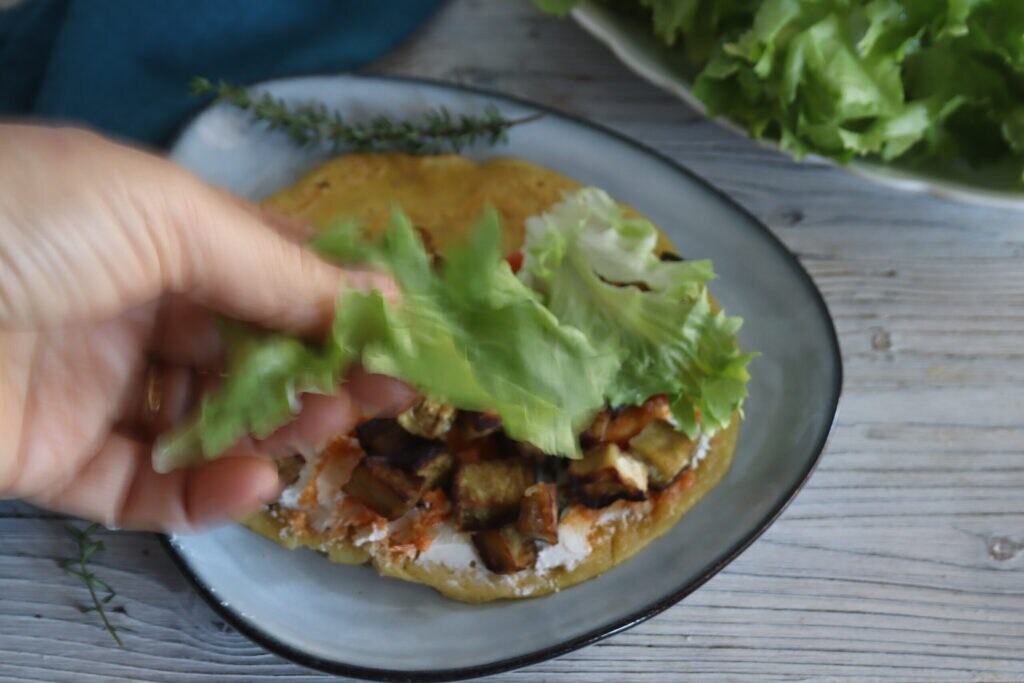 Piadina avec aubergines et robiola et évidemment un peu de salade pour rendre le tout plus joyeux et vivant rien qu’en la regardant. La piadina si légère (ne contient pas de saindoux) et nutritive (avec de la farine de pois chiches) avec un assaisonnement adéquat pour la garnir est idéale même pour ceux qui souhaitent suivre un régime sain et équilibré. La piadina est typique de Romagne et est un aliment qui se cuit en quelques minutes. En Romagne, on la prépare vraiment bien et avec seulement quatre ingrédients, dont justement l’un est le saindoux, mais sachez qu’il est facile d’en trouver aussi à l’huile d’olive ou vierge extra tout aussi bonnes.