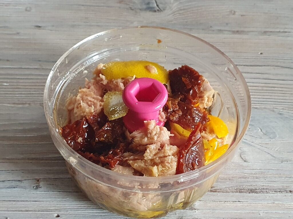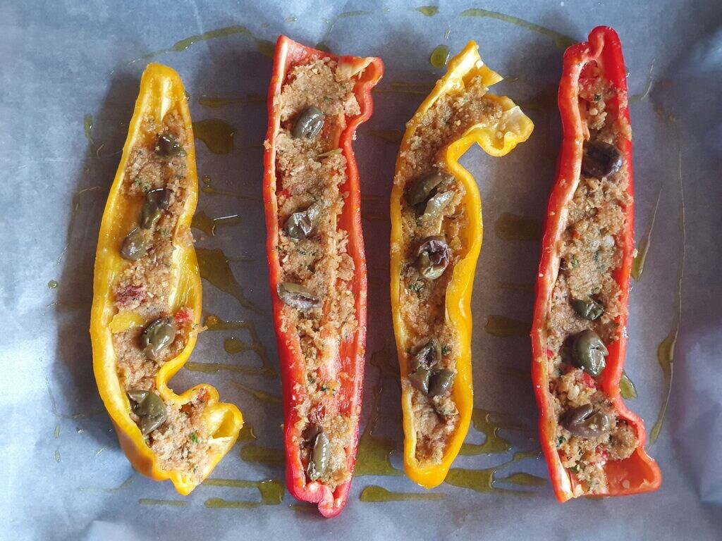 • Dans le bol du hachoir, mettez tous les ingrédients, sauf les olives vertes écrasées, hachez-les et après avoir lavé et séché les poivrons, remplissez-les en répartissant la farce en parts égales dans les 2 poivrons ouverts en livre.