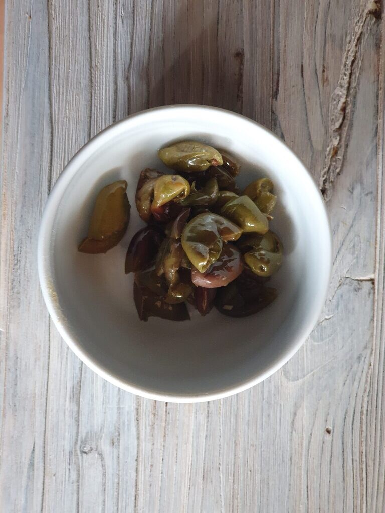 • Émincez les olives vertes écrasées et disposez-les sur les demi-poivrons farcis.