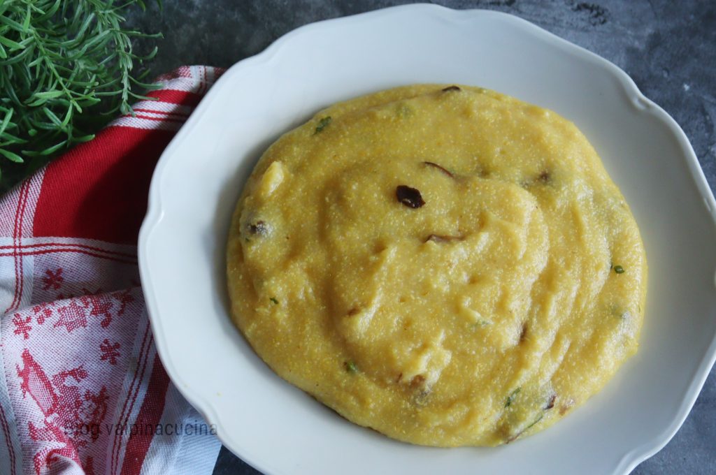 Polenta aux cèpes déjà prête à être cuisinée avec tous les champignons secs incorporés. J’ai immédiatement voulu essayer un paquet acheté spécialement en Valteline, précisément à S. Caterina Valfurva, pendant l’un de mes voyages en camping-car. Fantastique et très facile à préparer, pratiquement comme toutes les autres polentas, mais avec une petite différence : à l’intérieur du paquet, il y a aussi des cèpes secs, ce qui en fait un plat encore plus savoureux et complet. La belle chose est que le maïs est une céréale sans gluten, ce qui nous le fait aimer encore plus par tout le monde. Donc, si vous souhaitez préparer un déjeuner pour tous, pour les cœliaques, sans lactose et vegan, c’est parfait.