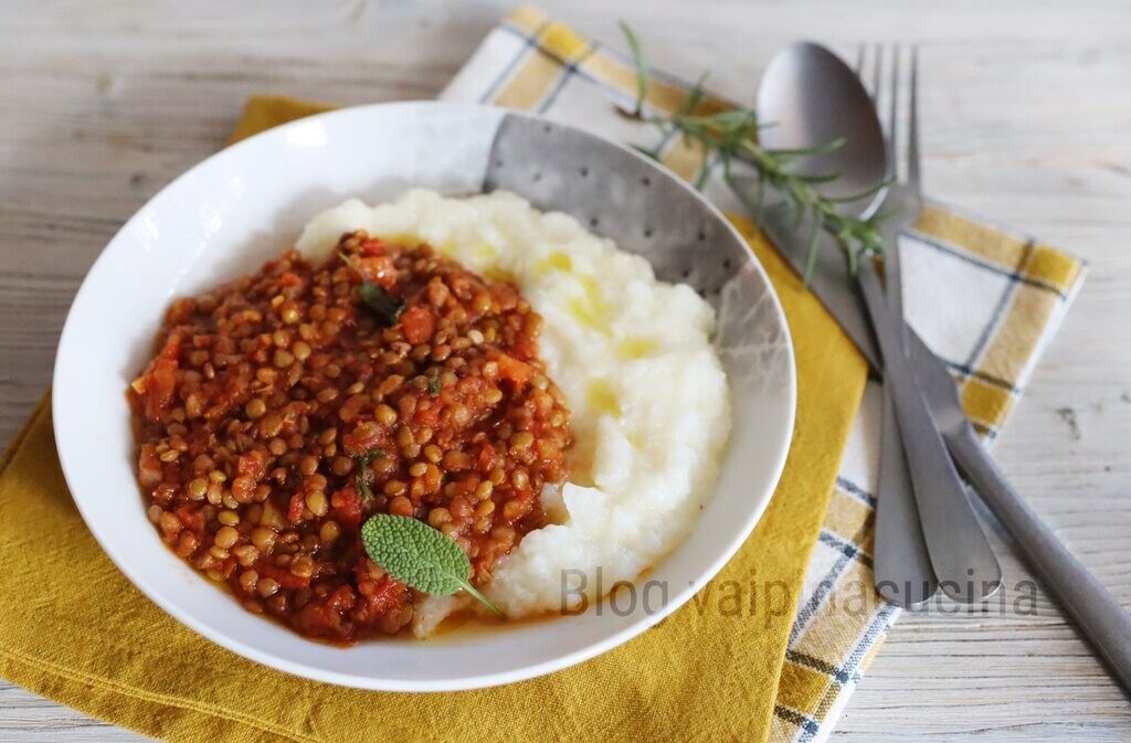 Polenta blanche avec ragoût de lentilles, une bonne alternative à la polenta de farine de maïs classique. Pour cette recette, j’ai opté pour la farine sans gluten blanche de maïs bramata typique de la Vénétie, évidemment je l’ai achetée lors d’un de mes voyages dans les Dolomites, ici c’est difficile à trouver. Pour la garnir, j’ai préparé un ragoût de lentilles et à ce propos, je vous recommande un de mes fantastiques plats de pâtes au ragoût de lentilles vegan. Cette recette de polenta blanche avec ragoût de lentilles plaît à ceux qui suivent une alimentation végétarienne et vegan, d’autant plus que les lentilles sont une bonne source de protéines végétales qui, avec la polenta blanche, aident ceux qui ne tolèrent pas bien le gluten et ont des intolérances.