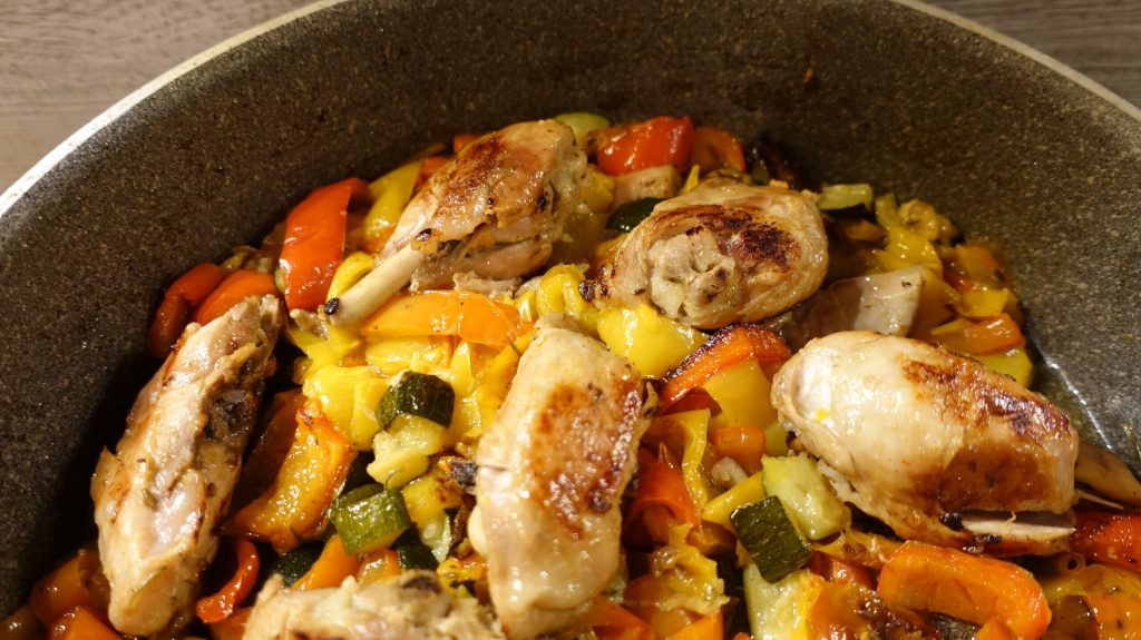 Encore pendant 15 minutes, j’ai fait dorer le poulet avec les poivrons et les courgettes, bien sûr, j’ai ajusté le sel et le poivre.