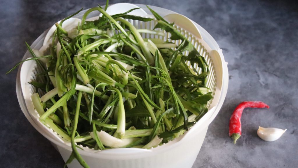 Égouttez les feuilles de puntarelle et, en attendant, mettez dans une poêle une gousse d’ail avec le piment et l’huile d’olive. Dès que l’ail devient doré, ajoutez les puntarelle et couvrez.