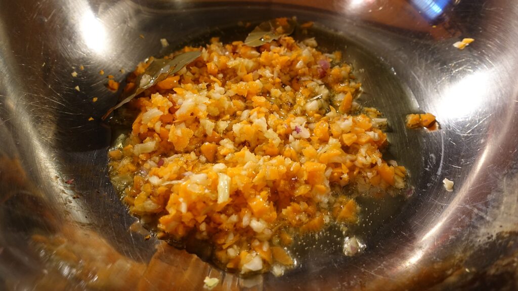 Passez au hachoir la carotte, le céleri et l’oignon. Mettez le mélange dans la casserole avec deux cuillères d’huile.