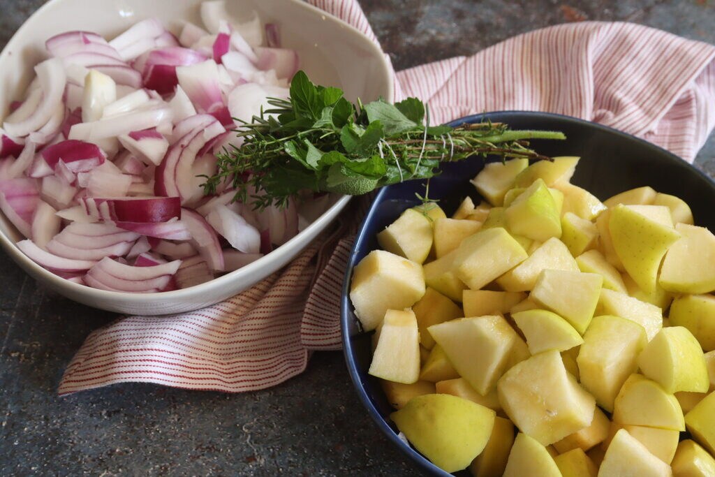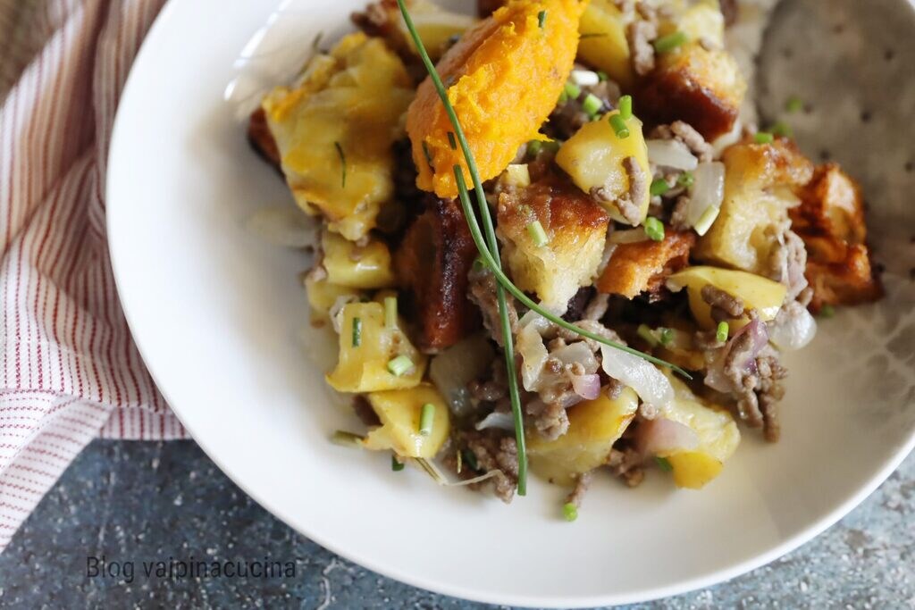 Ragoût de viande et légumes même si ce n’est pas exactement un ragoût au sens propre. Tout d’abord, il manque le poêle qui est la base de ce plat. Autrefois, il était utilisé comme moyen de cuisson et on l’appelait ragoût de viande et légumes pendant longtemps. Mais le ragoût désigne également une méthode de cuisson lente avec du bouillon ou de la tomate. La mienne était une recette complexe, ou plutôt je dirais plus un plat unique avec viande, légumes et pain, mais aussi des fruits comme les pommes que j’adore souvent ajouter dans mes plats salés avec de la viande, le tout accompagné d’aromates frais fraîchement cueillis dans le jardin.