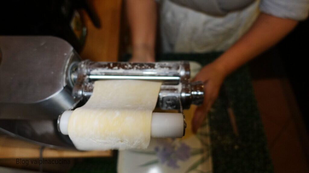 • Ma garniture est très simple à préparer, elle est déjà importante en elle-même, pas besoin de l’élaborer davantage. La porchetta a sa propre personnalité, j’ai utilisé seulement trois ingrédients. Dans le hachoir, j’ai mis le lait, le parmesan et naturellement la porchetta. J’ai haché peu, je ne voulais pas réaliser une crème mais une garniture moelleuse et soutenue. Pour préparer la pâte, j’ai mis dans le bol du mélangeur la farine avec les œufs, le sel avec de l’eau. Après avoir laissé reposer la pâte aux œufs pendant 30 minutes, j’ai étalé la pâte fine.