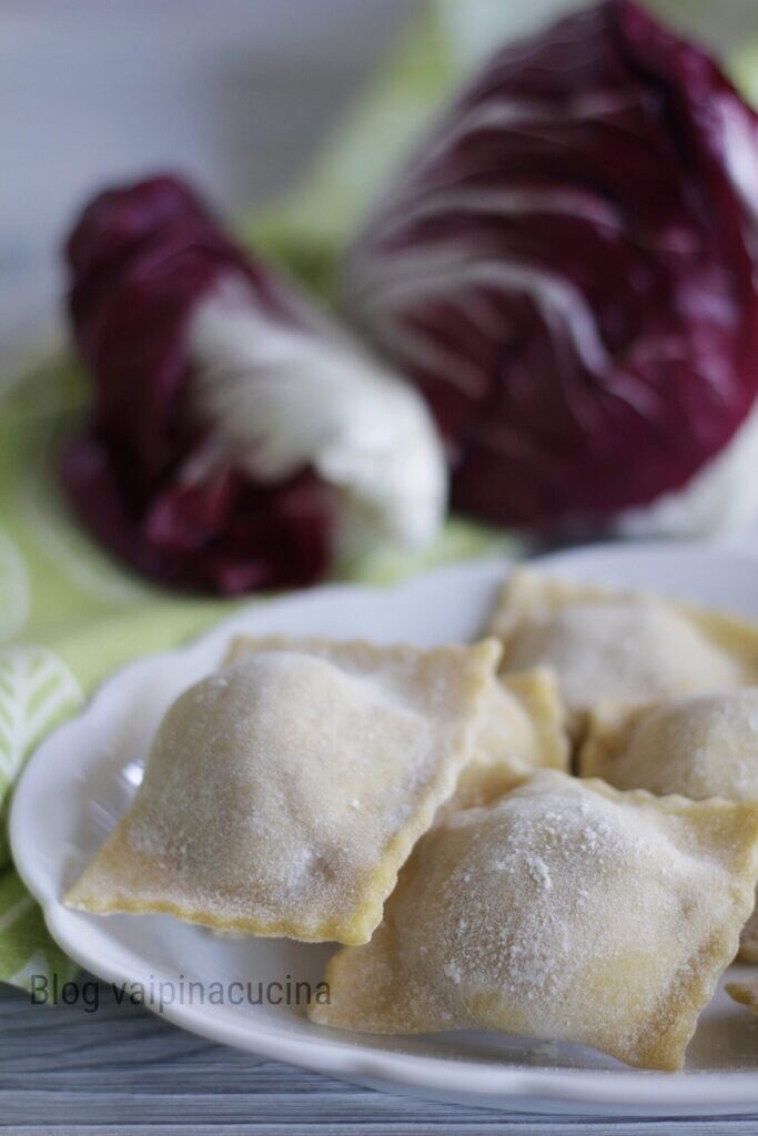Raviolis de porchetta assaisonnés avec une simple sauce tomate au basilic et à l’ail, ou comme je l’ai fait aujourd’hui, avec un pesto de radicchio. Avec 300 grammes de pâte aux œufs, j’ai préparé 20 raviolis avec une farce de porchetta. Préparons la pâte nous-mêmes, aujourd’hui à la maison nous avons tous une aide précieuse, la technologie nous offre des moyens fantastiques qui nous permettent de simplifier voire de réduire les temps de travail. Je me souviens encore lorsque ma grand-mère préparait des pâtes fraîches faites maison, le pain, tout préparé à la main par elle. Cela fait longtemps que, avec mon amie, nous pensons et repensons aux raviolis de porchetta. L’idée de les préparer aujourd’hui est venue spontanément lorsque, dans le sac de courses, j’ai trouvé l’inspiration de deux de mes achats, le radicchio et une tranche de porchetta. Pourquoi ne pas les unir ? Dit, fait.