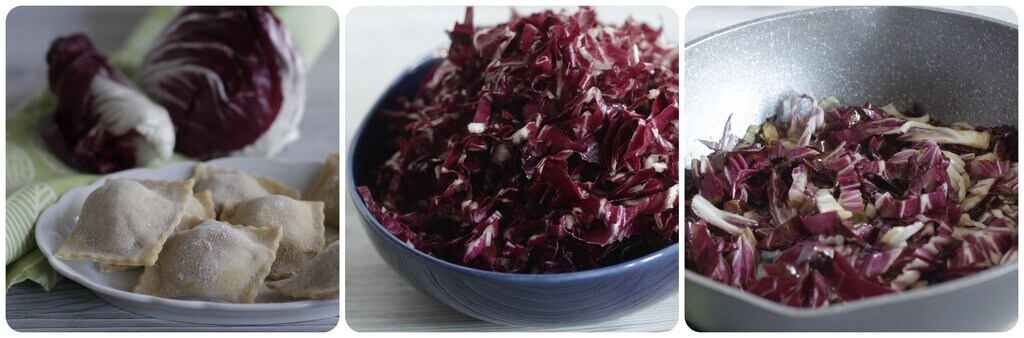 • J’ai étalé la pâte et j’ai réparti la garniture en la plaçant au centre de la pâte à l’aide d’une cuillère, je l’ai recouverte avec une autre pâte et avec la roulette dentelée, j’ai découpé les contours du ravioli. Pour les assaisonner, j’ai fait mijoter le radicchio avec une demi-échalote pendant 15 minutes. Un tiers du mélange, je l’ai passé au hachoir avec 20 grammes de parmesan et une louche d’eau de cuisson des raviolis pour donner de la crémeux sans utiliser d’autres fromages ou crèmes.