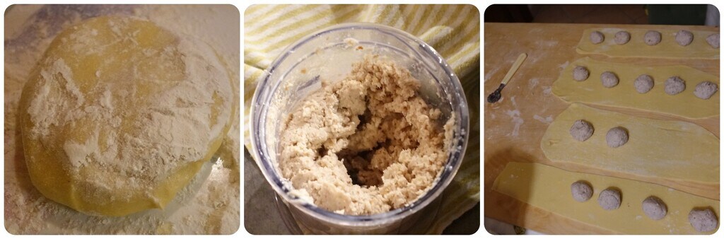 • Ma garniture est très simple à préparer, elle est déjà importante en elle-même, pas besoin de l’élaborer davantage. La porchetta a sa propre personnalité, j’ai utilisé seulement trois ingrédients. Dans le hachoir, j’ai mis le lait, le parmesan et naturellement la porchetta. J’ai haché peu, je ne voulais pas réaliser une crème mais une garniture moelleuse et soutenue. Pour préparer la pâte, j’ai mis dans le bol du mélangeur la farine avec les œufs, le sel avec de l’eau. Après avoir laissé reposer la pâte aux œufs pendant 30 minutes, j’ai étalé la pâte fine.