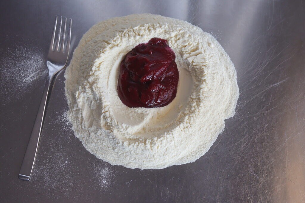 débutez lentement à mélanger et amalgamer les deux ingrédients avec la fourchette. La farce des raviolis est généralement déjà assez consistante et je n’ajoute donc pas d’œufs dans la pâte rouge, juste un peu d’eau si nécessaire.