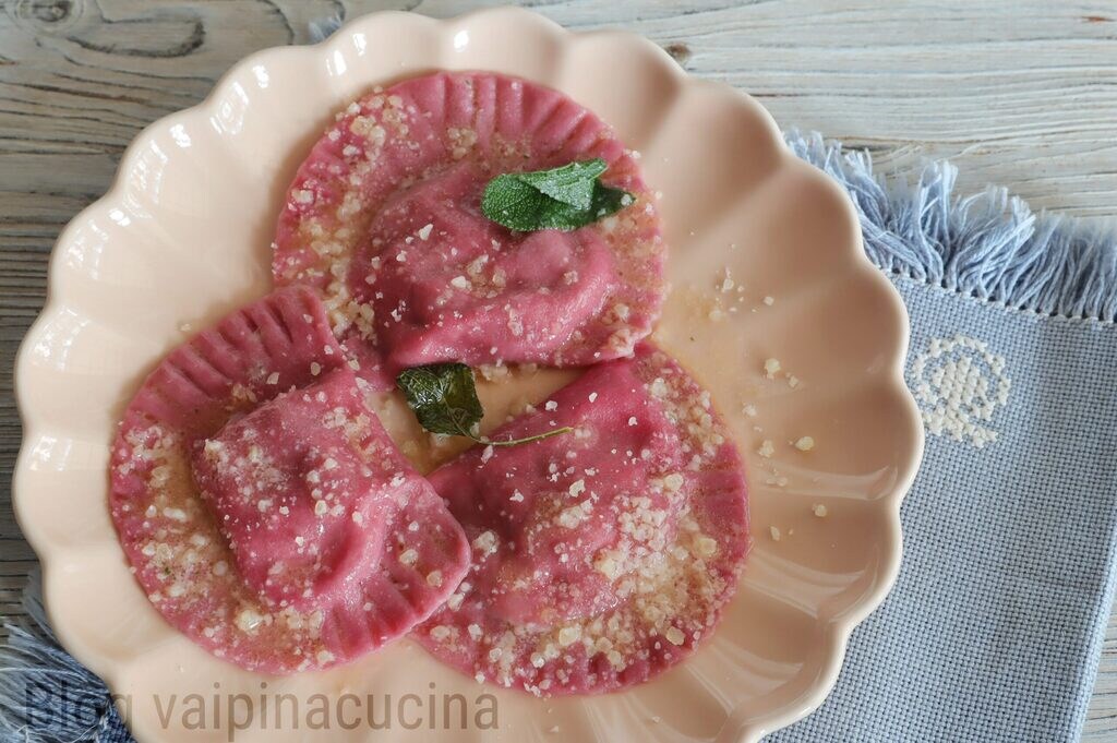 Raviolis rouges beurre et sauge, je dirais plutôt d’un violet intense car j’ai utilisé la betterave pelée et réduite en purée dans le mixeur. Dans notre tradition gastronomique, le roi des plats est sûrement les pâtes, le plat principal et non comme beaucoup le pensent l’entrée, qui est plus une dérivation internationale classifiant l’entrée comme plat principal. Les pâtes faites maison sont un véritable rituel familial transmis de génération en génération. Faire des pâtes maison est une tradition ancienne qui est de plus en plus difficile aujourd’hui pour les femmes surtout qui doivent souvent cuisiner à la hâte, mais le plaisir de préparer et de servir des raviolis fumants faits maison est toujours une grande satisfaction et je dirais même pas si difficile.
