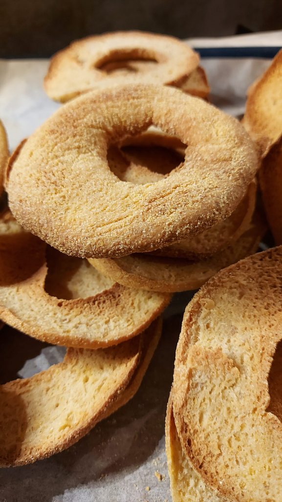En faisant très attention aux mains, dès que j’ai sorti les freselles du four et encore chaudes, je les ai ouvertes en deux horizontalement et remises au four encore à 210°C pour 20 minutes supplémentaires.