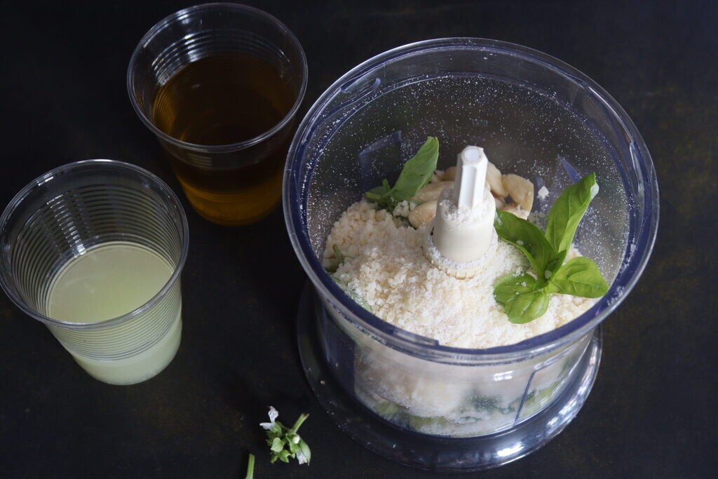 Je mets dans le hachoir le parmesan avec l’ail, le basilic et la menthe, les amandes émondées avec une pincée de sel.