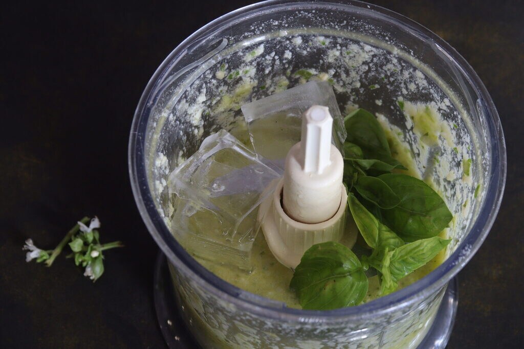 Enfin, j’ajoute trois cubes de glaçons, j’allume le hachoir pour quelques secondes en intermittence. Voici mon pesto de citron prêt, idéal pour les bruschettas ou pour assaisonner les pâtes, sans cuisson et prêt en quelques secondes. Si vous ne souhaitez pas utiliser d’amandes, vous pouvez utiliser des pignons de pin ou d’autres fruits secs comme les noix de cajou.