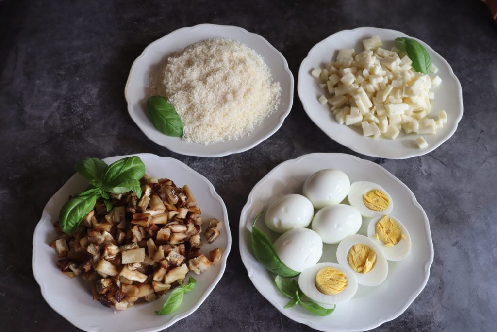 Je fais cuire les anelletti pendant 5 minutes et je les refroidis dans de l’eau froide pour arrêter la cuisson. Je prépare le parmesan râpé et je coupe le caciocavallo en petits morceaux.