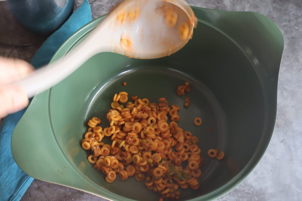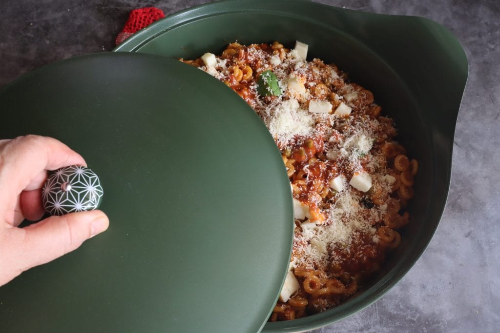 • Je commence à disposer les anelletti sans huile et sans chapelure, car le revêtement minéral antiadhésif de la casserole empêche les aliments de coller.