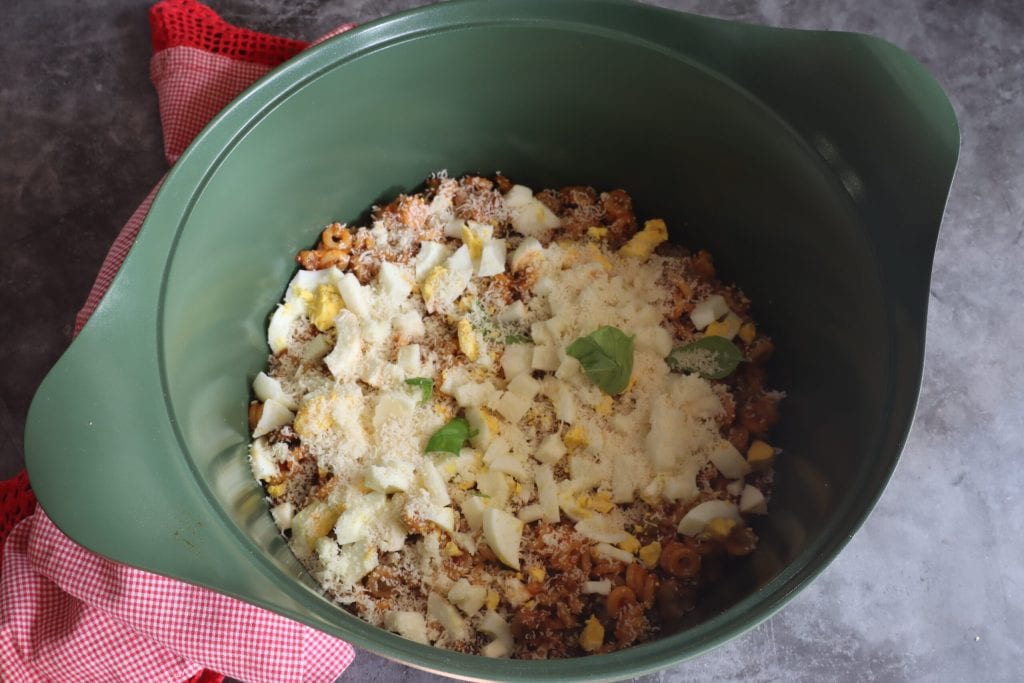 • Tout d’abord, j’assaisonne les anelletti avec le ragù de viande. Sans salir d’autres bols, je le fais dans la casserole où j’ai fait bouillir les pâtes. Je garde une tasse de ragù pour la dernière couche.