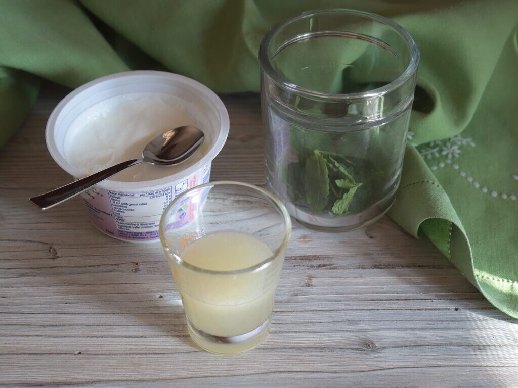 Dans le hachoir, mettez les feuilles de menthe fraîche avec le sel, le yaourt et le jus de citron.
