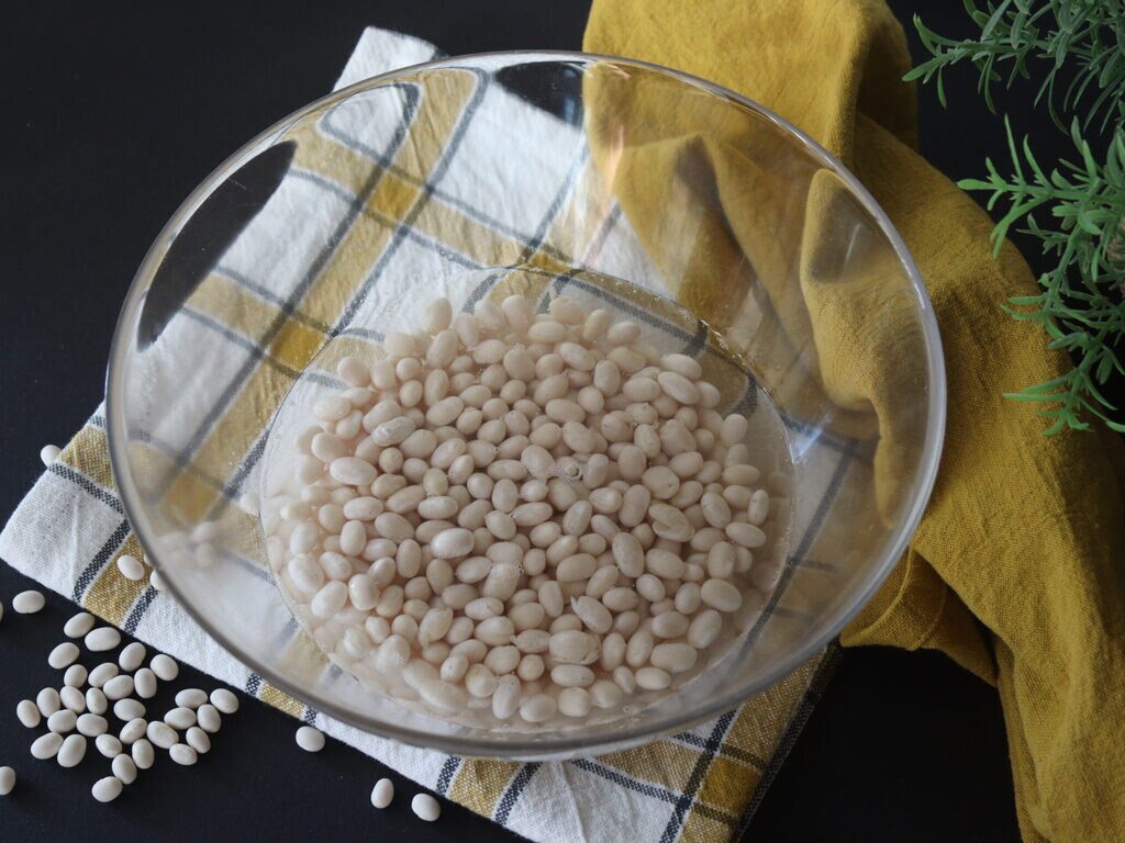 Avec deux litres d’eau, les haricots du purgatoire trempés la veille, la carotte, l’oignon et le céleri, je prépare un litre et 700 de bouillon. Cent grammes de haricots après une nuit de trempage deviennent 200 grammes.