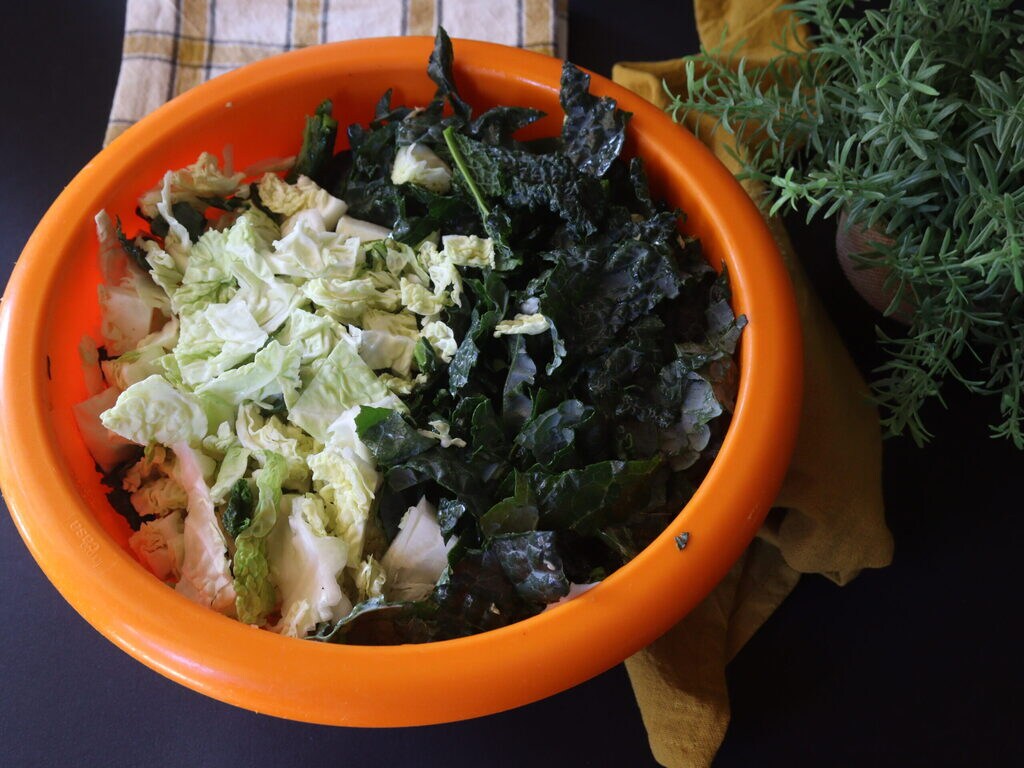 Après avoir bien lavé le chou noir et le chou frisé, je les coupe en morceaux et je les laisse égoutter.