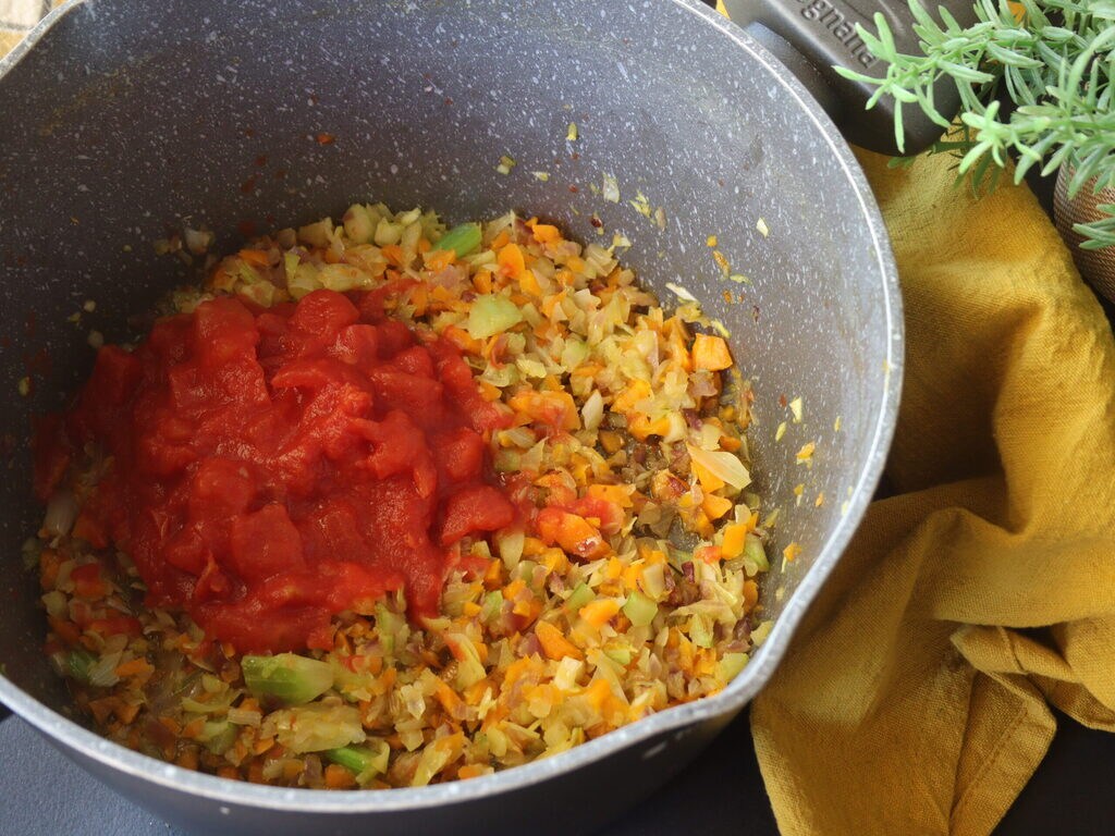 Dans le soffritto doré, j’ajoute la pulpe de tomate.