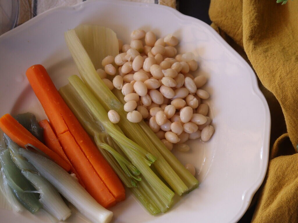 J’ai filtré le bouillon des haricots et les légumes de la cuisson je les ai mis