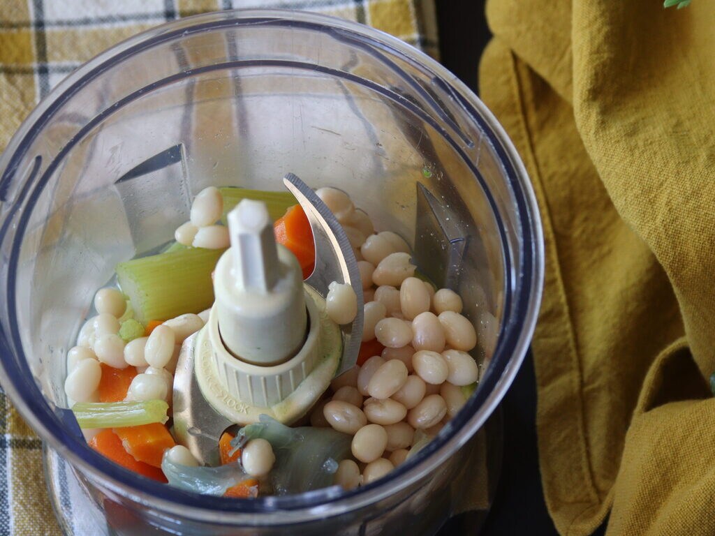 dans le hachoir avec la tasse de haricots (préalablement mise de côté)