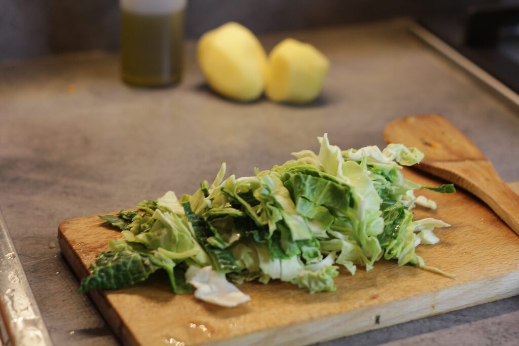 Continuez avec la découpe du chou noir après l’avoir bien lavé, et du chou frisé que vous ajouterez à la poêle avec le mélange. Faites de même avec les pommes de terre après les avoir pelées, coupez-les en dés et ajoutez-les à la ribollita.