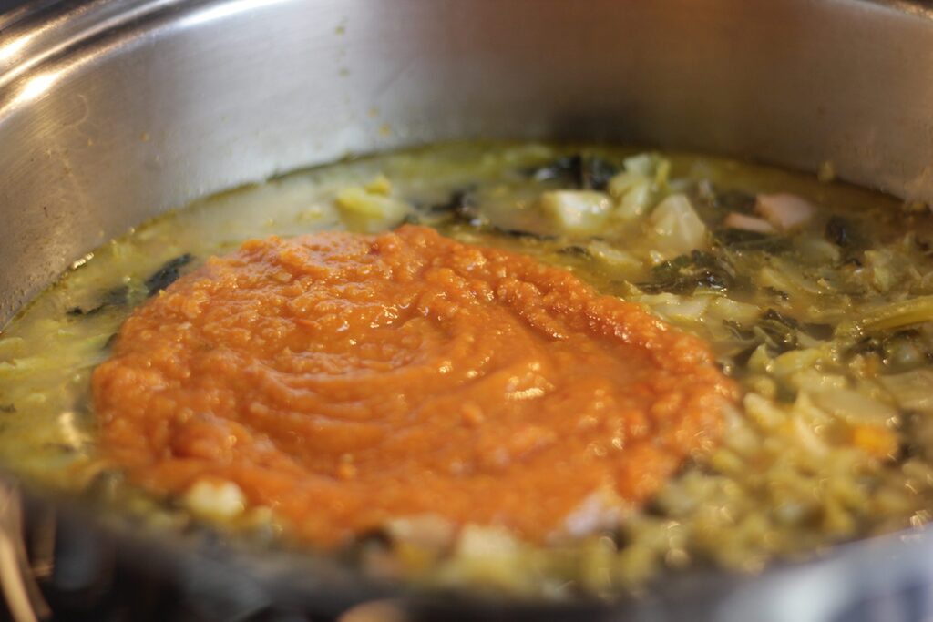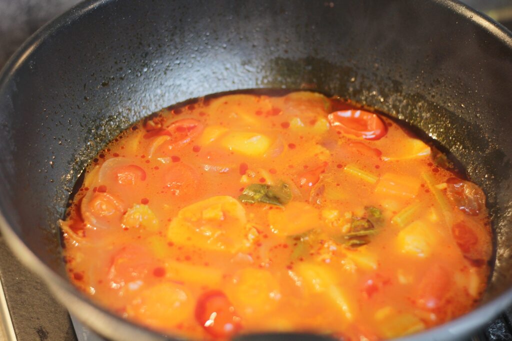 Préparez une base avec l’oignon, la carotte, le céleri, le piment et l’huile d’olive extra-vierge, puis ajoutez les tomates, deux pommes de terre et deux verres d’eau, couvrez et laissez cuire pendant une demi-heure.
