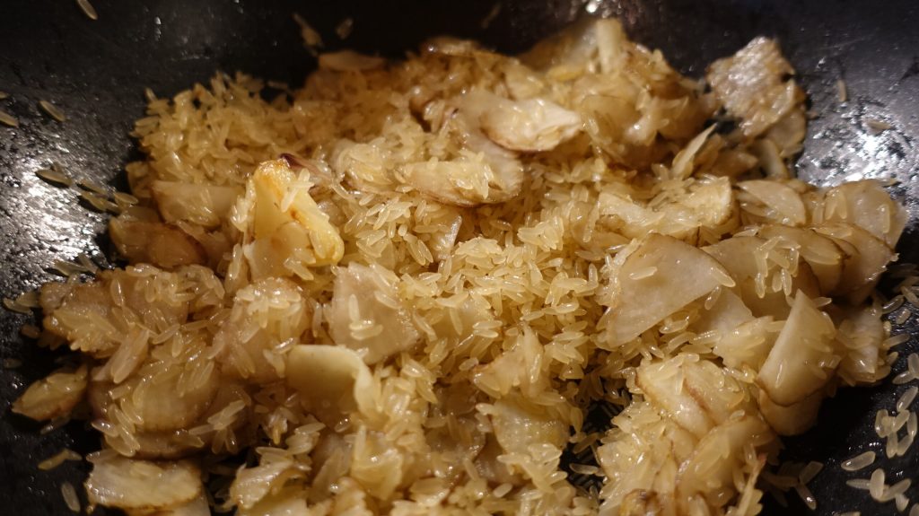 • Ajoutez le riz et faites-le griller dans l’huile aromatisée à l’ail, déglacez avec le vin blanc et ajustez le sel.
