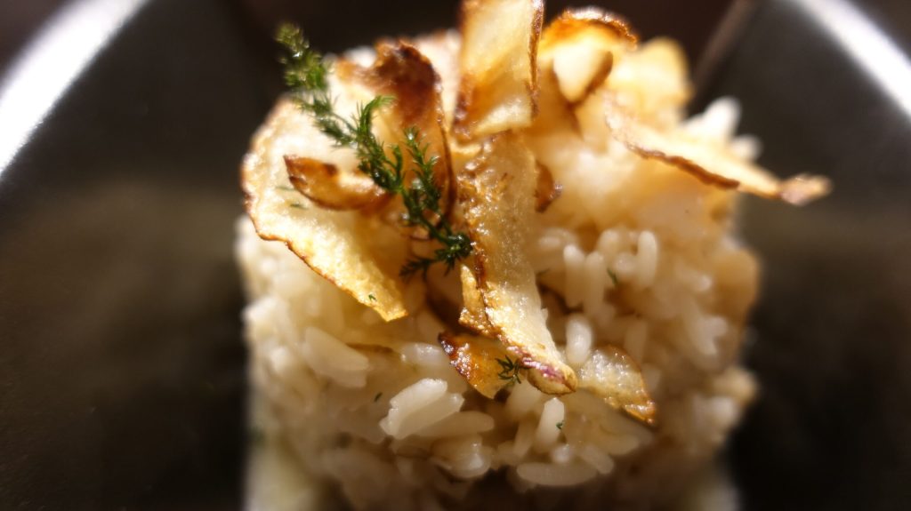 • Voici prêt le risotto au topinambour avec chips et fenouil sauvage.