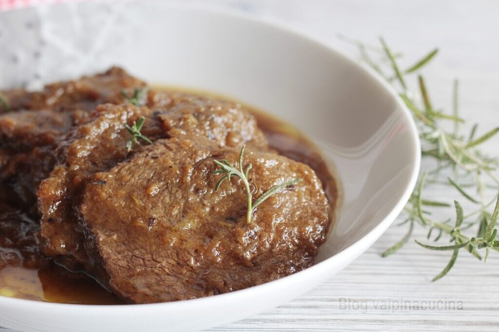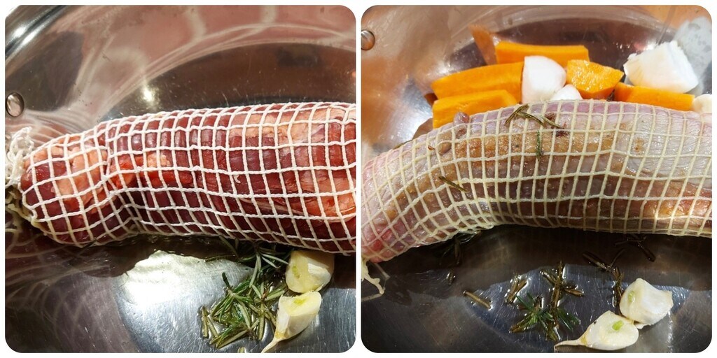 • Utilisez une casserole ovale où la viande tient bien en longueur. Mettez trois cuillères d’huile avec l’ail et dès qu’il chauffe un peu, ajoutez la viande à feu vif, faites-la bien dorer de tous les côtés en la retournant souvent. Ajoutez les condiments, les carottes avec les oignons, le céleri avec l’échalote et le romarin. Après avoir bien fait dorer le tout, déglacez avec le vin et ajoutez le laurier avec les graines de fenouil. Faites cuire à feu doux pendant une heure et demie en retournant souvent le rôti. En fin de cuisson, retirez le filet et coupez-le en tranches. Après avoir retiré les deux feuilles de laurier, passez les légumes au hachoir, servez-le accompagné de la sauce.