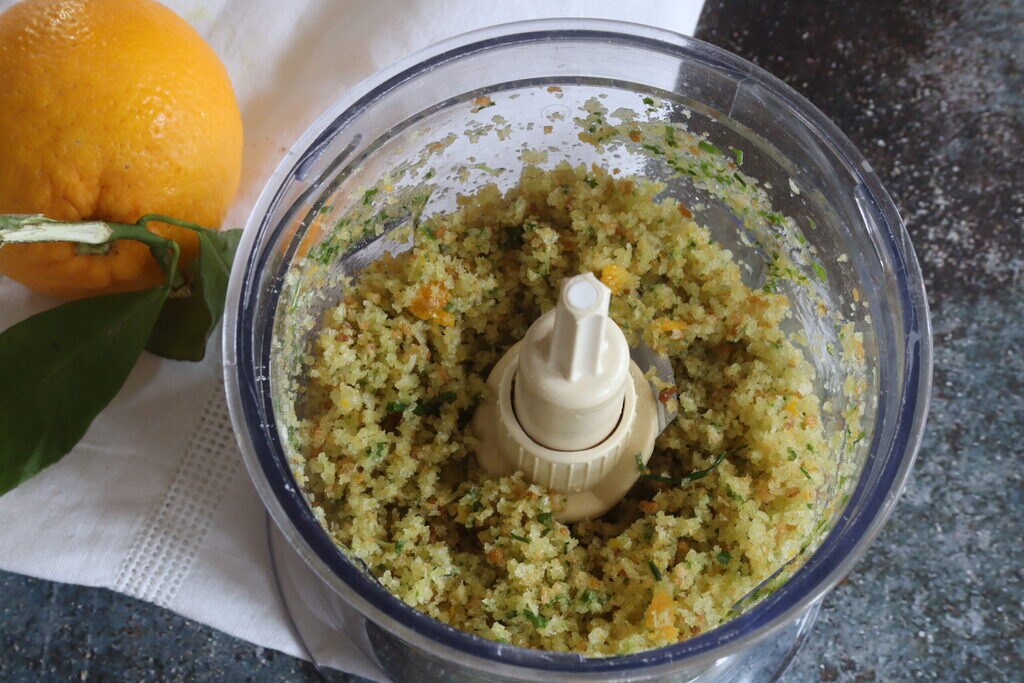 En attendant qu’ils refroidissent, préparez la farce. Dans le hachoir, mettez la chapelure avec l’ail et le zeste d’orange, le basilic avec la ciboulette et la moitié de l’huile totale, n’oubliez pas le sel.