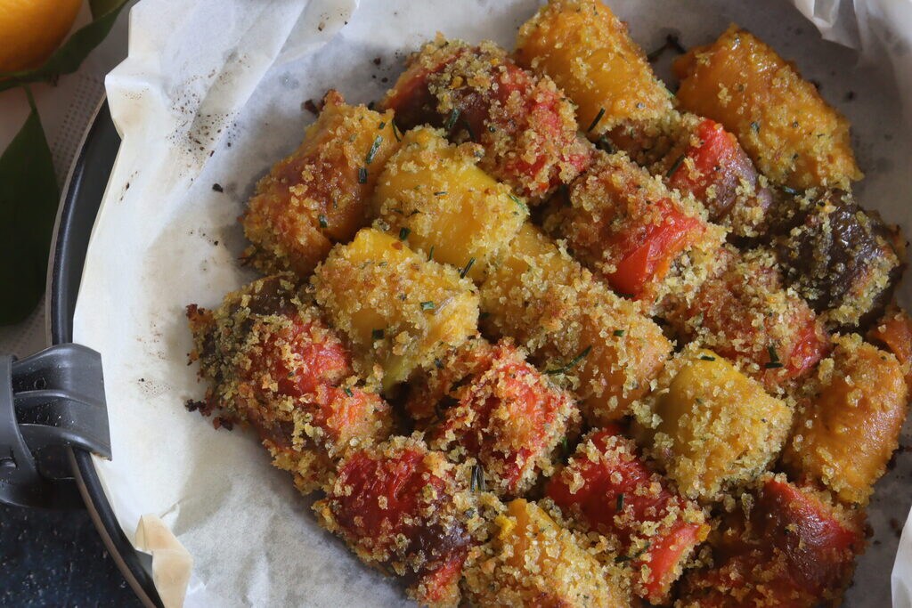 Sur une planche à découper, disposez les filets de poivrons et répartissez une partie de la chapelure aromatisée et assaisonnée, roulez-les et continuez de cette manière pour tous les poivrons.