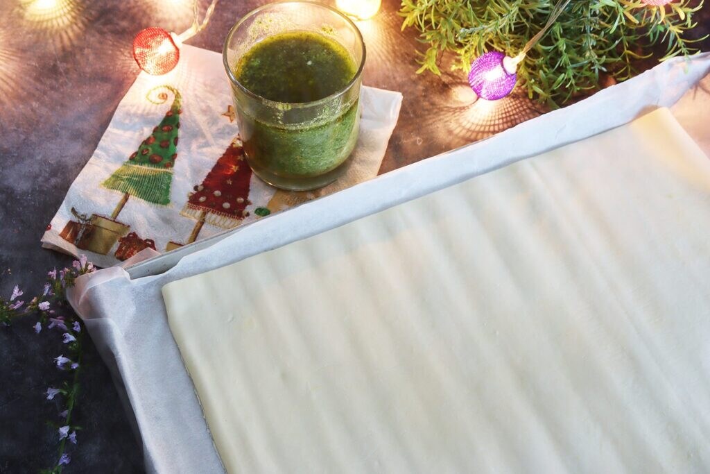 • Le papier sulfurisé n’est pas nécessaire, il est déjà dans le rouleau de pâte feuilletée, j’ai utilisé celui rectangulaire pour la commodité. Déroulez-la et