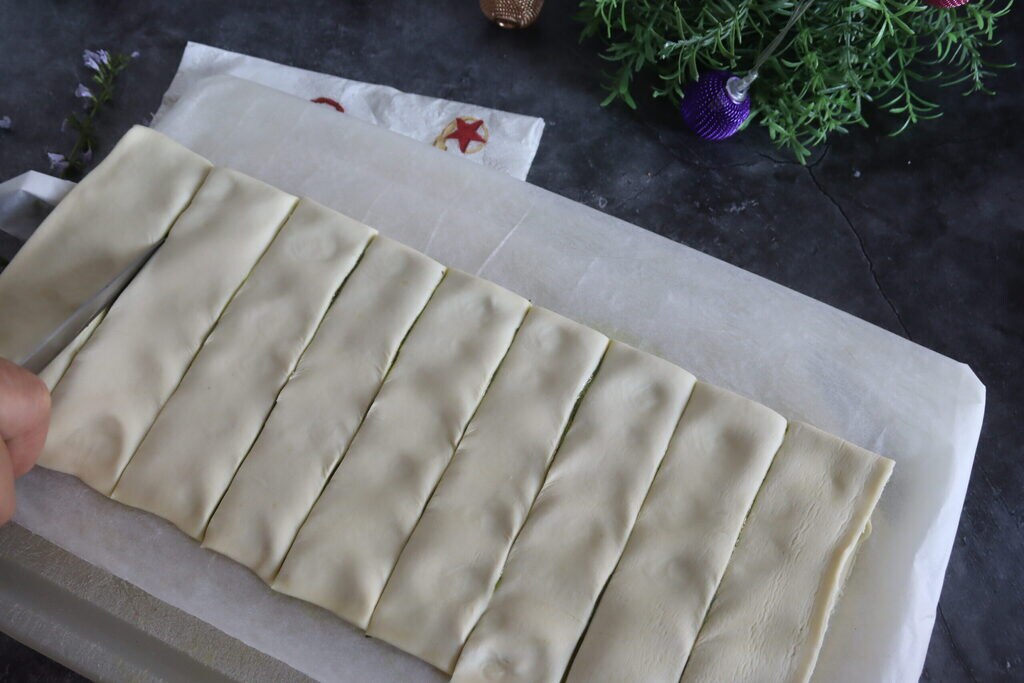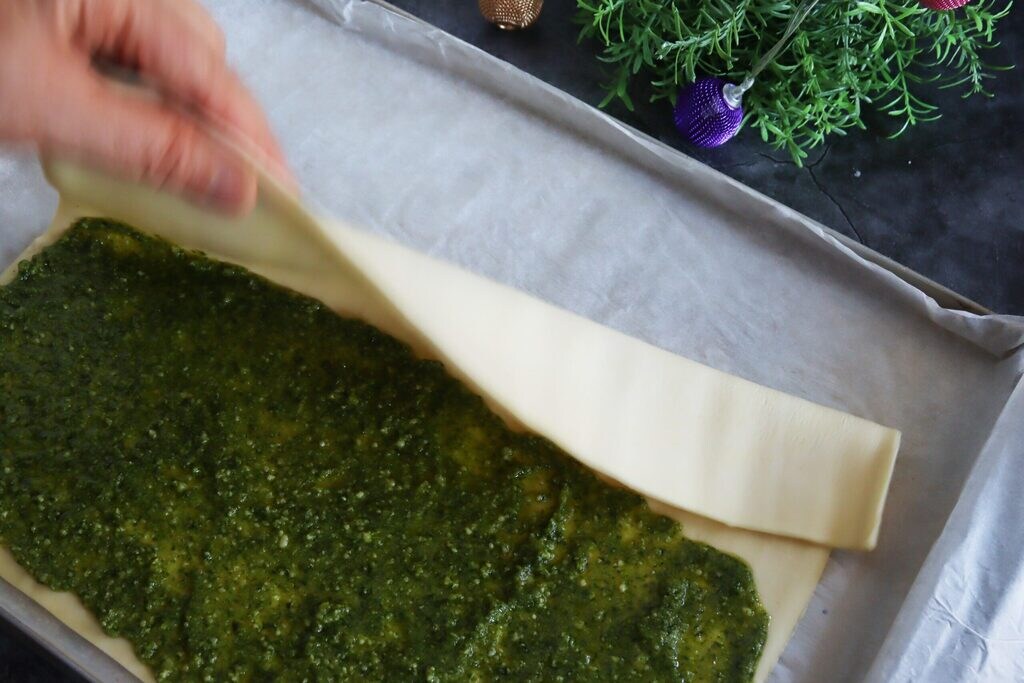 • roulez sur eux-mêmes les bandes de pâte feuilletée avec le pesto à l’intérieur.