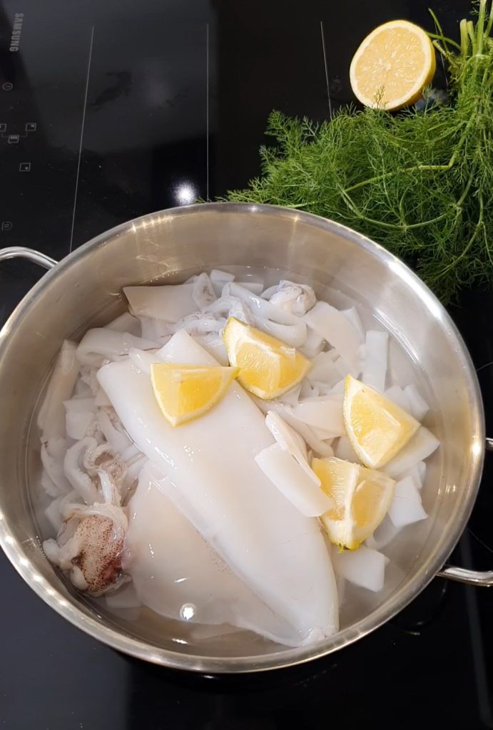 Je coupe un demi-citron en quatre parties et je le mets dans la casserole avec les calamars. J’ajoute l’eau, je mets le couvercle et je fais cuire pendant 25 minutes.