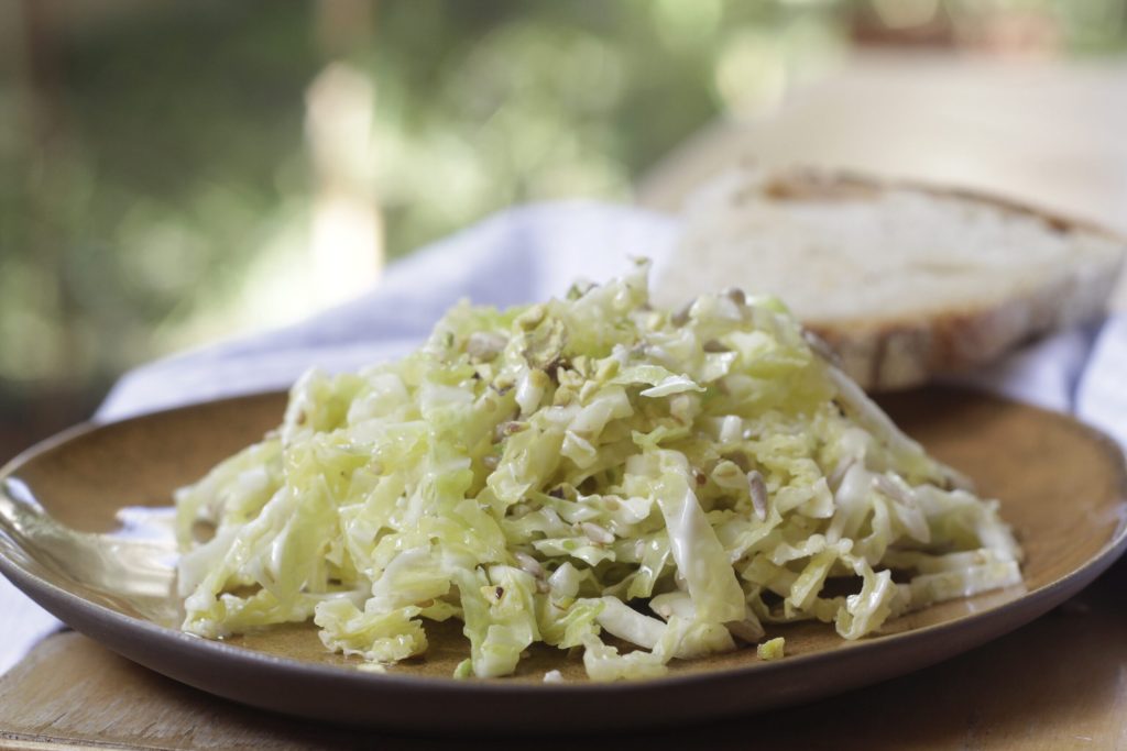 Préparez la vinaigrette avec l’huile d’olive extra vierge, la moutarde et le vinaigre de cidre, les graines et bien sûr le sel. Mélangez tous les ingrédients.