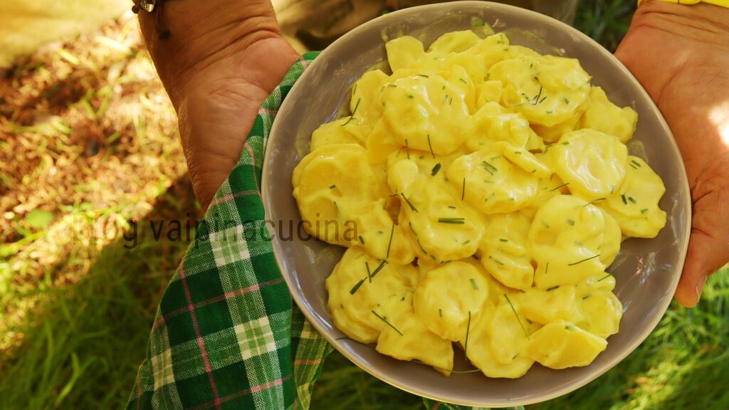 Elle est généralement préparée avec du bouillon, mais aujourd’hui j’ai préféré une préparation plus rapide et j’ai ajouté à ma salade de pommes de terre allemande une simple sauce en version végétalienne en utilisant une boisson de soja. Dans certaines recettes allemandes, elles sont préparées avec l’ajout d’oignon frais finement coupé, mais je la préfère avec beaucoup de ciboulette fraîche, essayez cette version et dites-moi ce que vous en pensez.