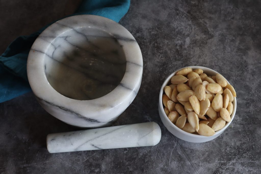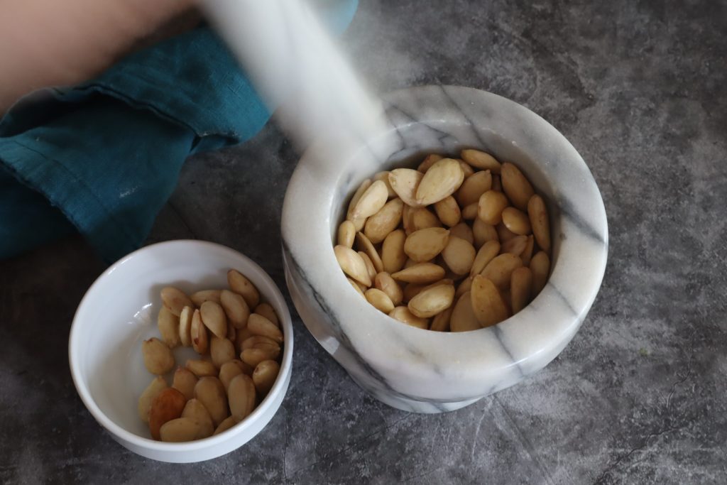 • Hachez une moitié généreuse des amandes avec le mortier (ou le robot)