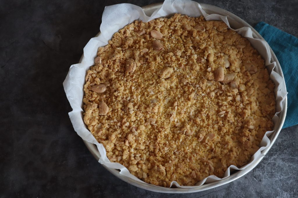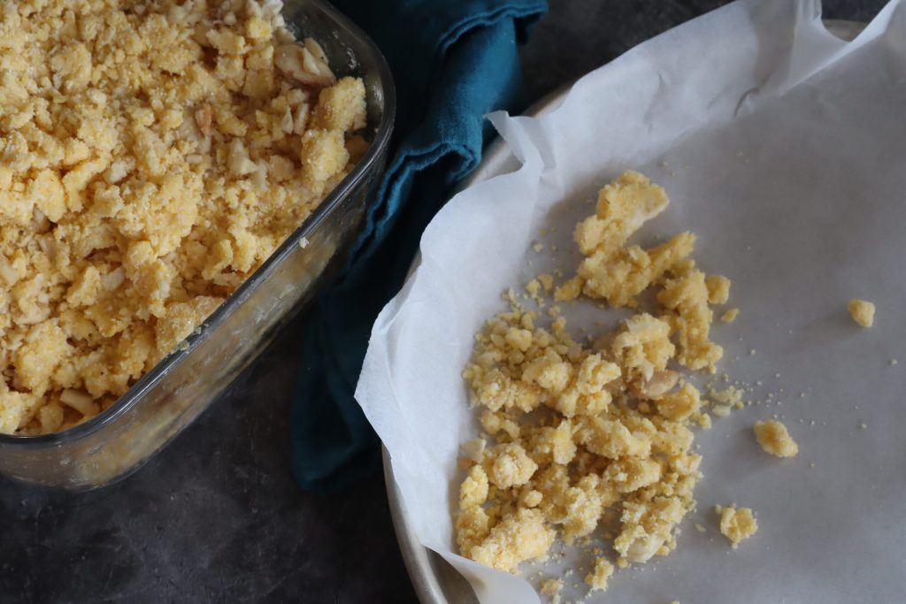 • Tapissez le moule de papier cuisson et commencez à émietter la pâte ainsi avec vos doigts.