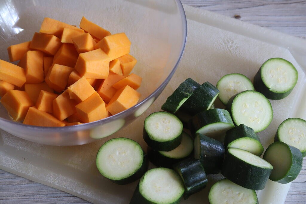 Enlevez la peau du potiron et coupez-le en dés, coupez également les courgettes en rondelles.