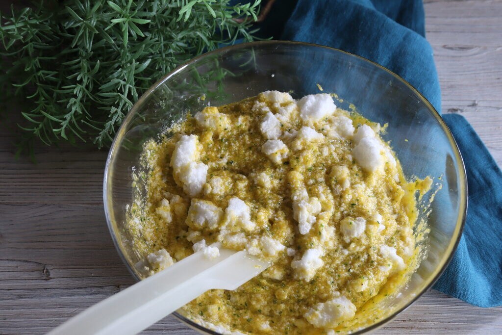 Incorporez délicatement les blancs d’œufs au reste du mélange de légumes à l’aide d’une spatule, en faisant des mouvements de bas en haut.