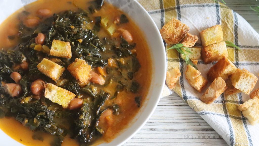 Soupe au chou noir et croûtons de pain sans sel, comme on dit en Toscane, ou non salé, frits avec du romarin, une délice, croyez-moi. Le chou noir, connu sous le nom de chou toscan ou chou palmier en raison de ses feuilles disposées comme celles des palmiers, n’a pas la tête caractéristique des autres choux. On le trouve sur le marché à la fin de l’automne ou au début de l’hiver. Les amis, il fait froid ici et j’ai trouvé ce bouquet de chou noir au marché. Comme j’adore ça, je l’ai pris en me consolant que c’est malheureusement le dernier de la saison. Je pense que la semaine prochaine, ils disparaîtront des étals de fruits et légumes.