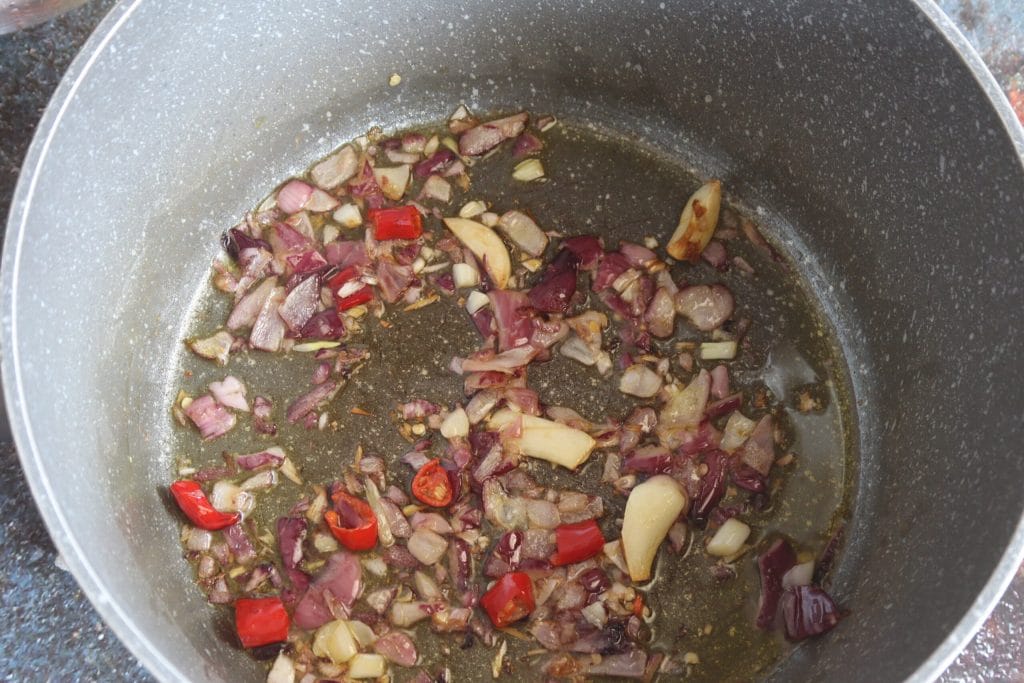 Dans la casserole, mettez l’huile d’olive avec l’ail, l’oignon finement haché et le piment fort, de préférence frais.