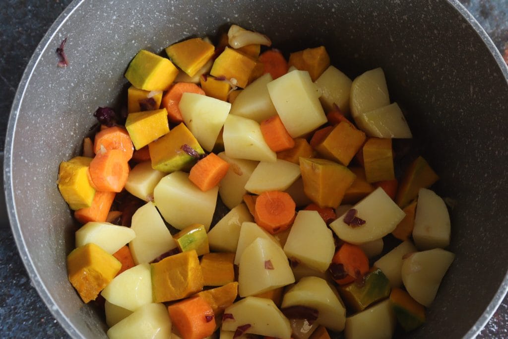 Coupez en dés les pommes de terre avec les carottes et la courge delica, toutes trois épluchées. Plongez-les dans la casserole.