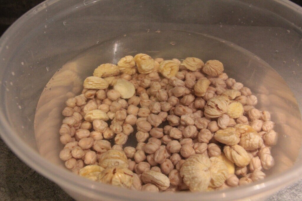 La veille de la soupe, mettez à tremper avec beaucoup d’eau les pois chiches et les châtaignes sèches ensemble.