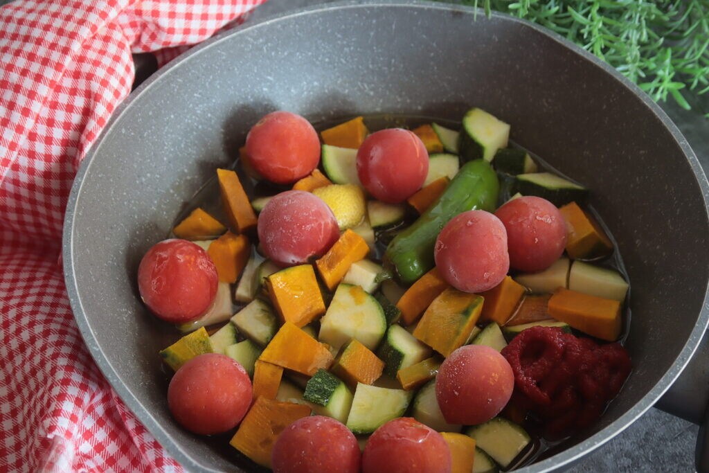 Après avoir coupé tous les légumes et les fruits à petites cubes, je les ai mis dans une casserole, y compris les petites tomates, j’ai ajouté l’eau et commencé à chauffer à feu doux.